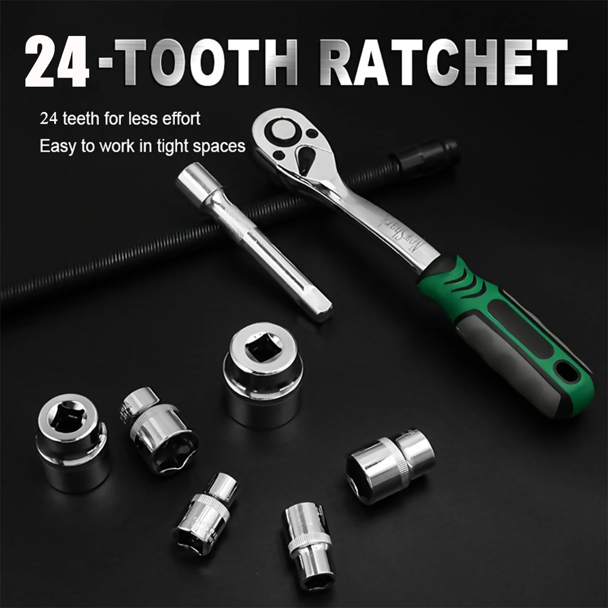 - 15-Piece Complete Set: Ratchet wrench, short sockets, aur 100MM extension rod shamil hain.