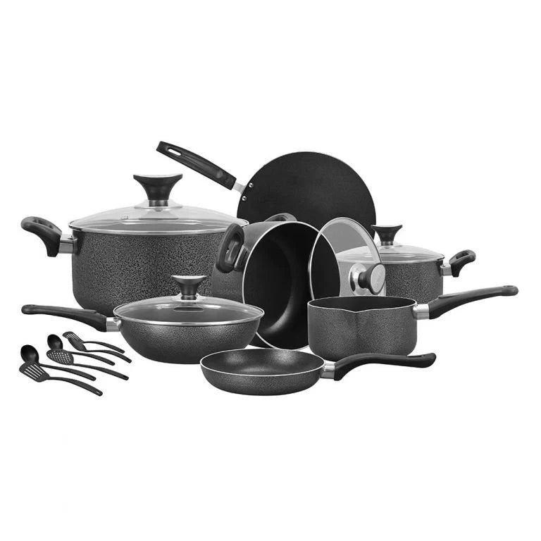 Apne kitchen ko upgrade karein is 17-piece non-stick cookware set ke saath, jo rozana pakwan banane ke liye stylish aur functional solution hai. Har piece high-quality aluminum se bana hai aur long-lasting non-stick coating rakhta hai jo sehatmand, kam tail wali cooking aur asani se safai ko yaqini banata hai. Sleek black finish aapke kitchen mein aik modern aur elegant touch deta hai.