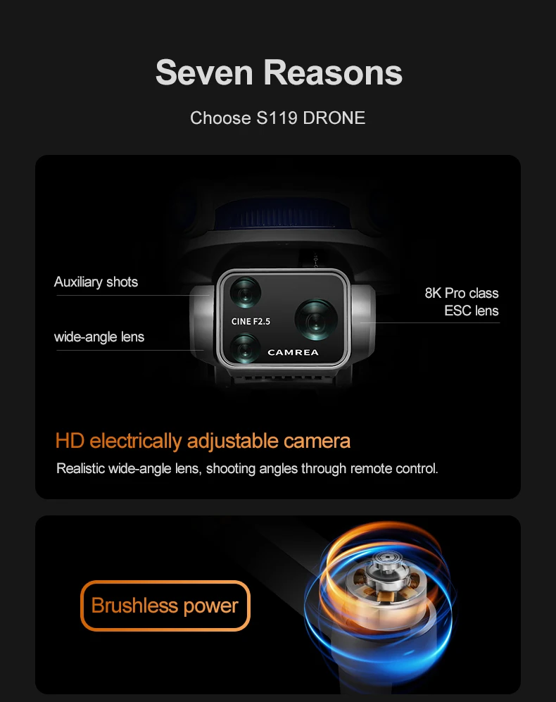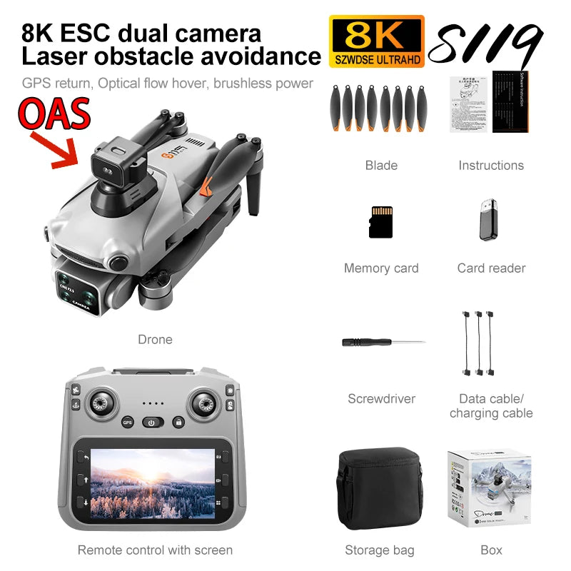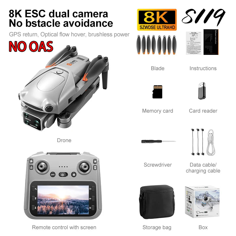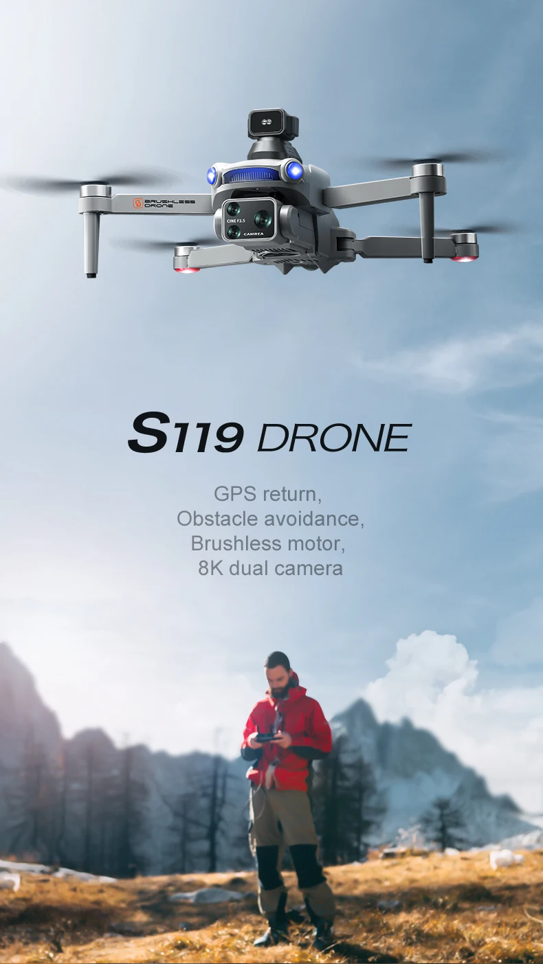 Introducing the 2025 Purilite Select S119 Drone, a next-generation professional drone designed for precision, power, and ultra-high-definition aerial photography. Equipped with an 8K HD dual camera, 5G WiFi real-time transmission, GPS positioning, and brushless motors, this foldable quadcopter delivers exceptional stability and cinematic-quality footage. The upgraded large screen remote controller allows for enhanced visibility and control, making it perfect for content creators, travelers, and drone enthusiasts. Whether you're filming landscapes or capturing moments from above, the S119 offers a top-tier flying experience.