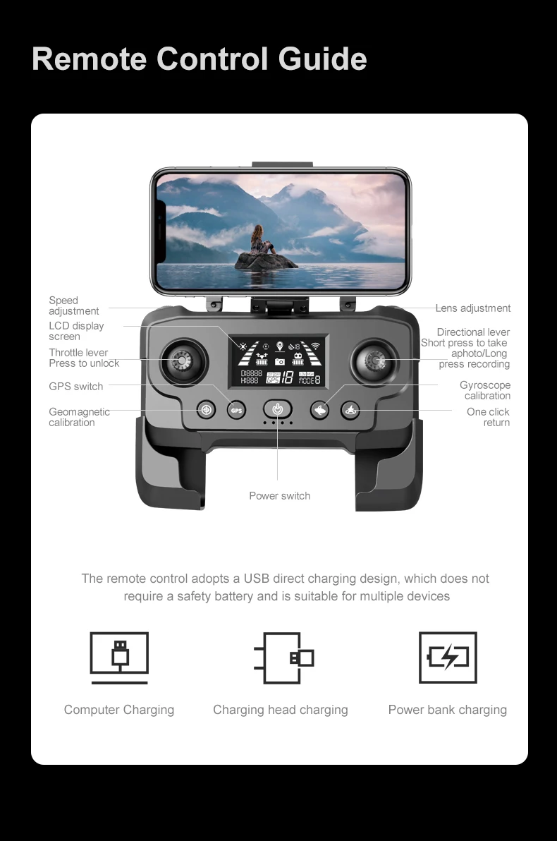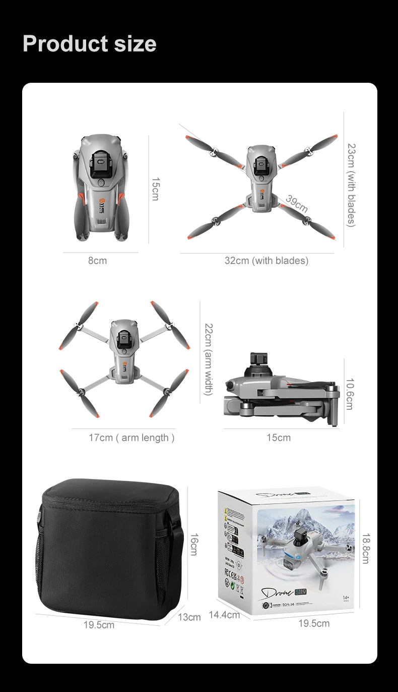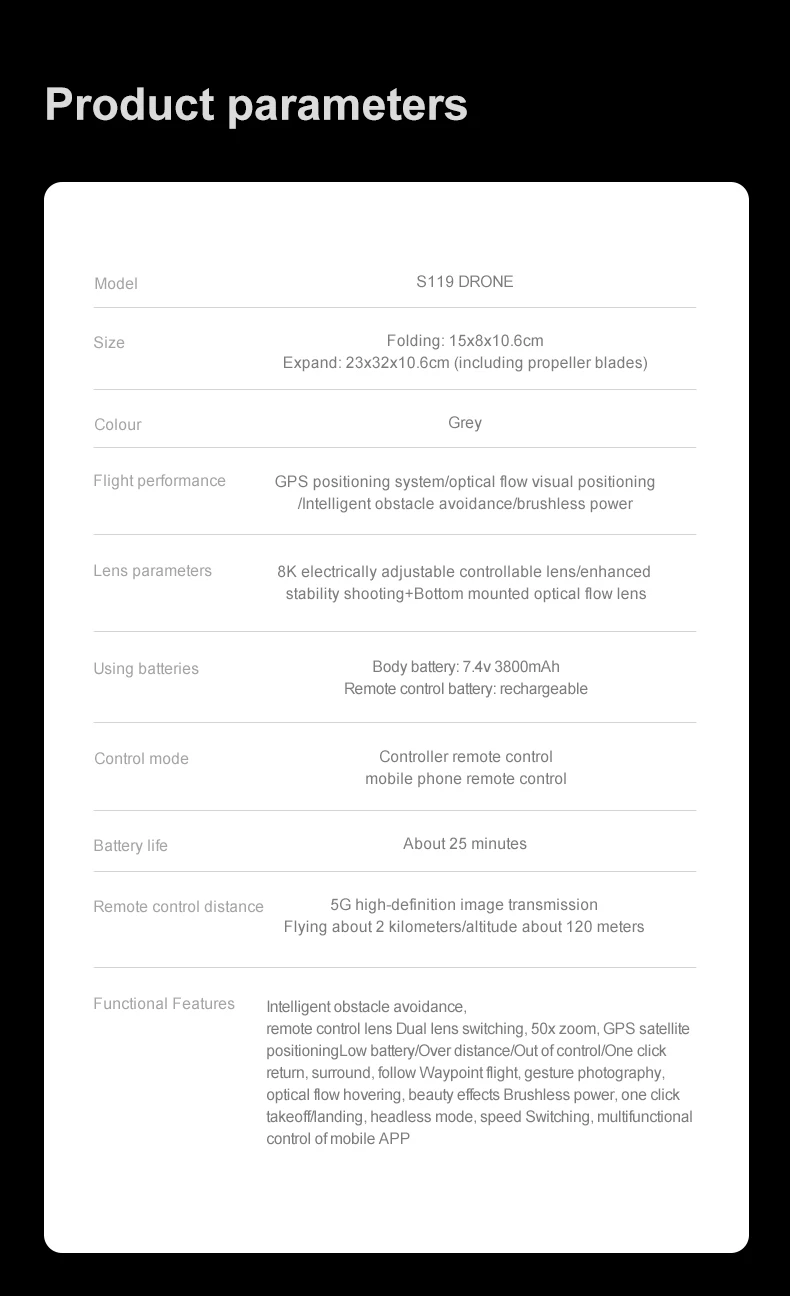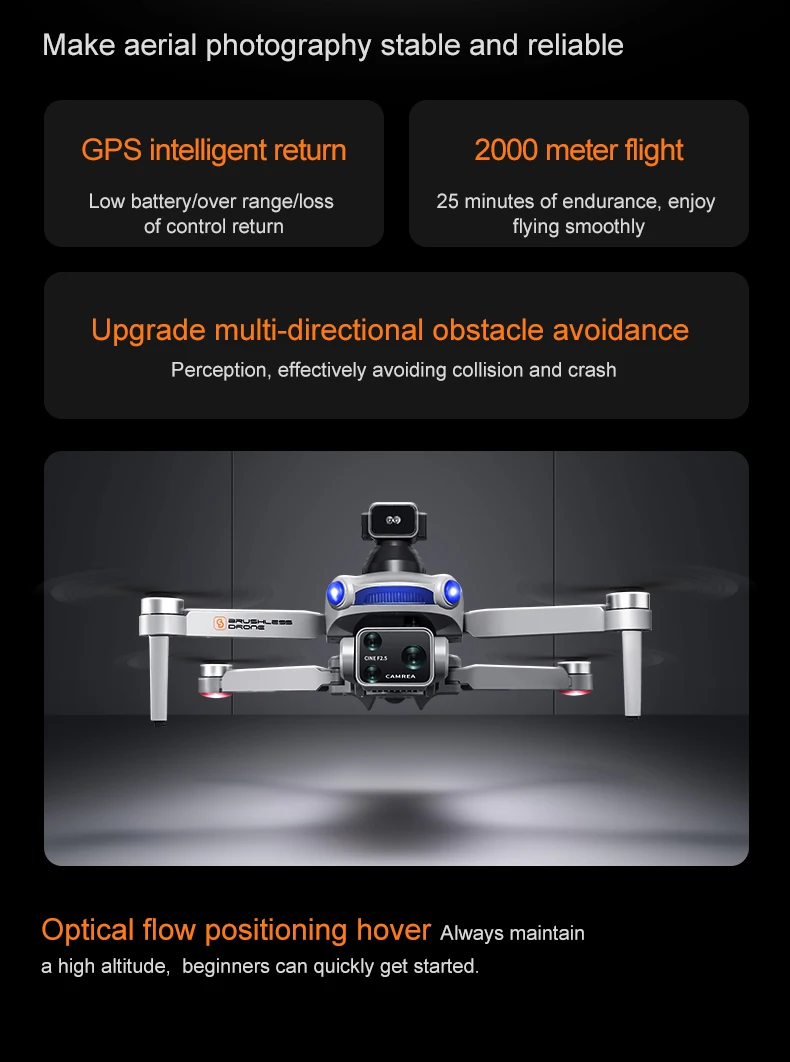 Introducing the 2025 Purilite Select S119 Drone, a next-generation professional drone designed for precision, power, and ultra-high-definition aerial photography. Equipped with an 8K HD dual camera, 5G WiFi real-time transmission, GPS positioning, and brushless motors, this foldable quadcopter delivers exceptional stability and cinematic-quality footage. The upgraded large screen remote controller allows for enhanced visibility and control, making it perfect for content creators, travelers, and drone enthusiasts. Whether you're filming landscapes or capturing moments from above, the S119 offers a top-tier flying experience.