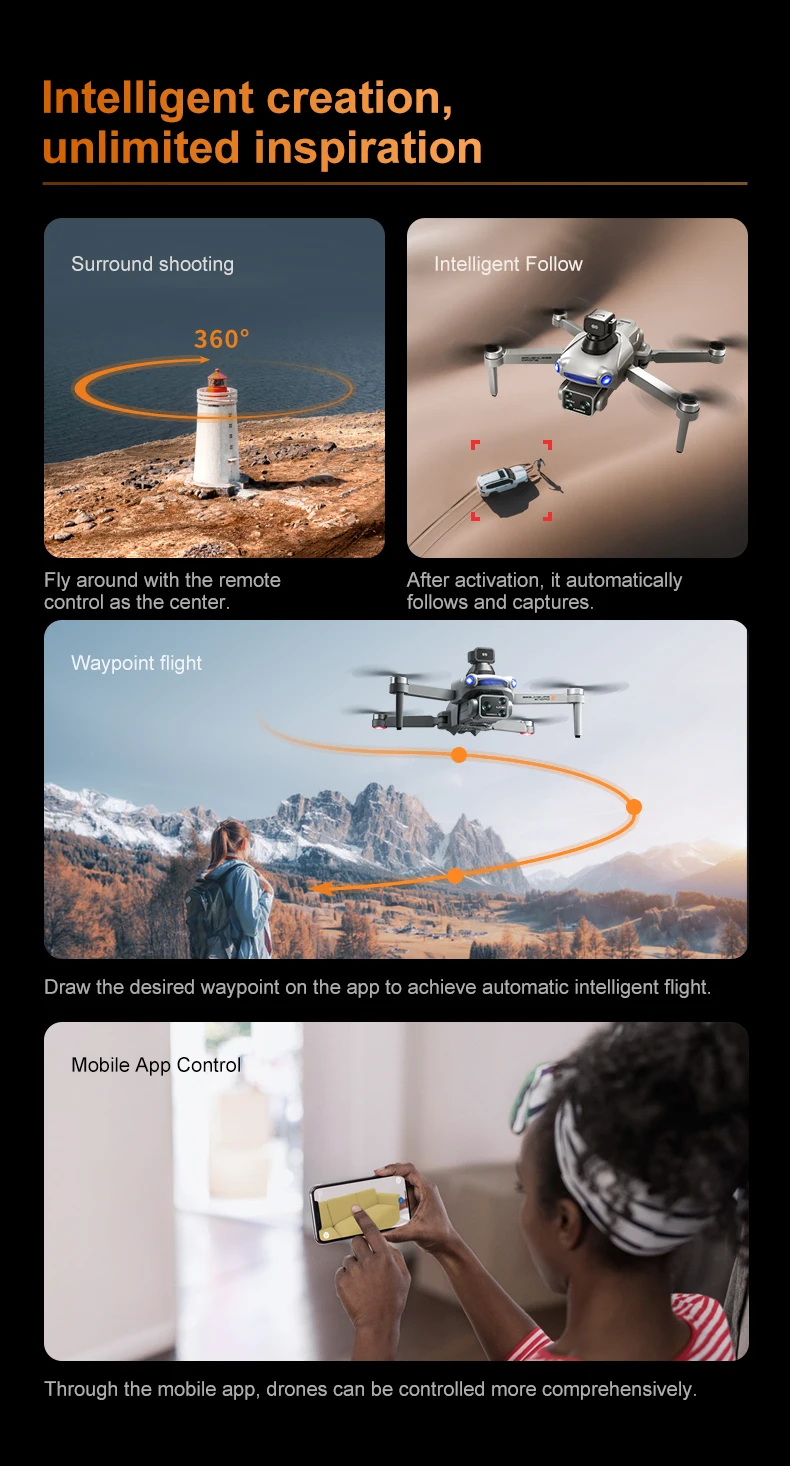 - Smart flight modes: Follow Me, Waypoint, Gesture Control, Return-to-Home