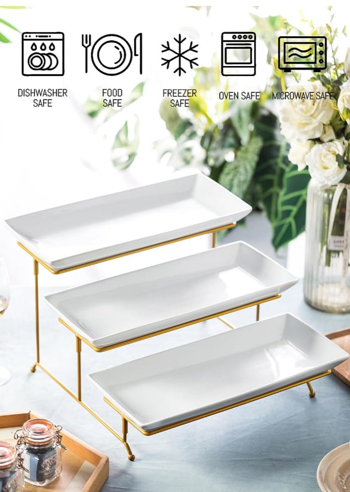 3 Tier Serving Tray with Golden Stand White Ceramic