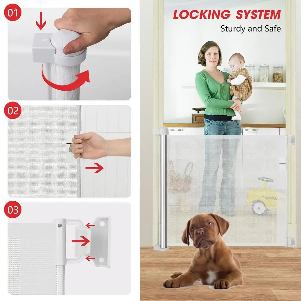 Constructed with durable PVC and metal components along with a strong mesh barrier, this gate offers stability and ventilation while reducing tripping hazards. The no-drill installation and adjustable hook system allow easy setup in different locations. A secure circular button lock ensures firm closure and double safety protection. With non-slip support and freestanding functionality, this gate is ideal for temporary or long-term home safety use.