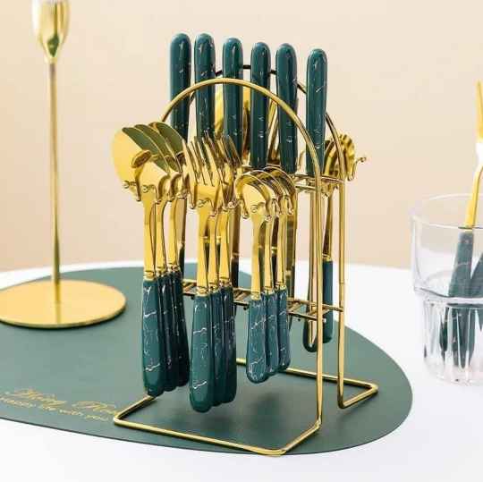 - ✅ Stylish Cutlery Rack – Comes with a gold-toned metal rack for neat storage and elegant display.