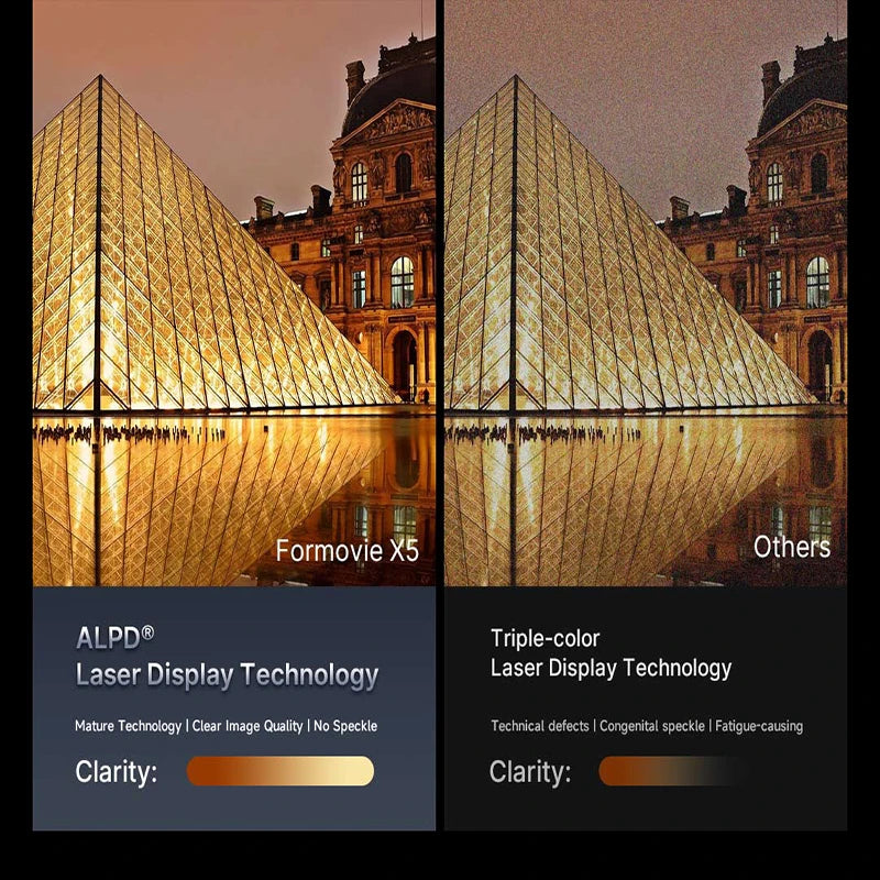 Experience high-end home cinema with the Purilite Select – Formovie X5 4K Projector, offering a true native 3840×2160 resolution for crisp, vibrant visuals. The DLP ALPD Tri-Color Laser + LED light source ensures energy efficiency, brilliant color accuracy, and deep blacks for immersive projection.