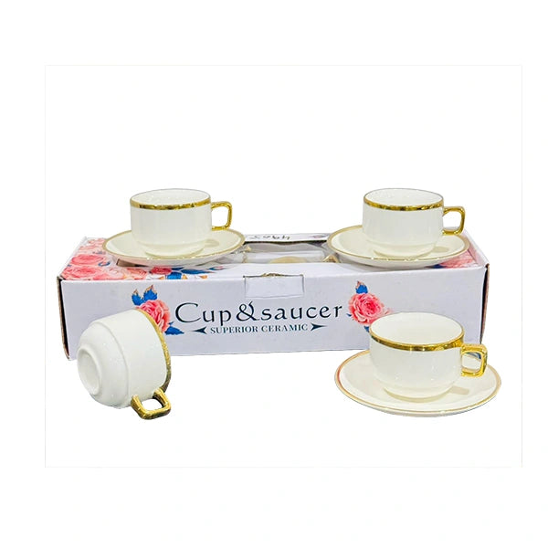 Apni chai ya coffee ke lamhon ko ek naya roop dein Gold Rim Ceramic Tea Cup aur Saucer Set ke saath, jo un logon ke liye design kiya gaya hai jo har roz ke lutf ko timeless elegance ke saath enjoy karte hain. Yeh set high-quality ceramic se bana hai, jisme safed glaze aur khubsurat gold rim aur handle shamil hain—jo har ek cup mein shaan aur nazakat ka izafa karte hain.