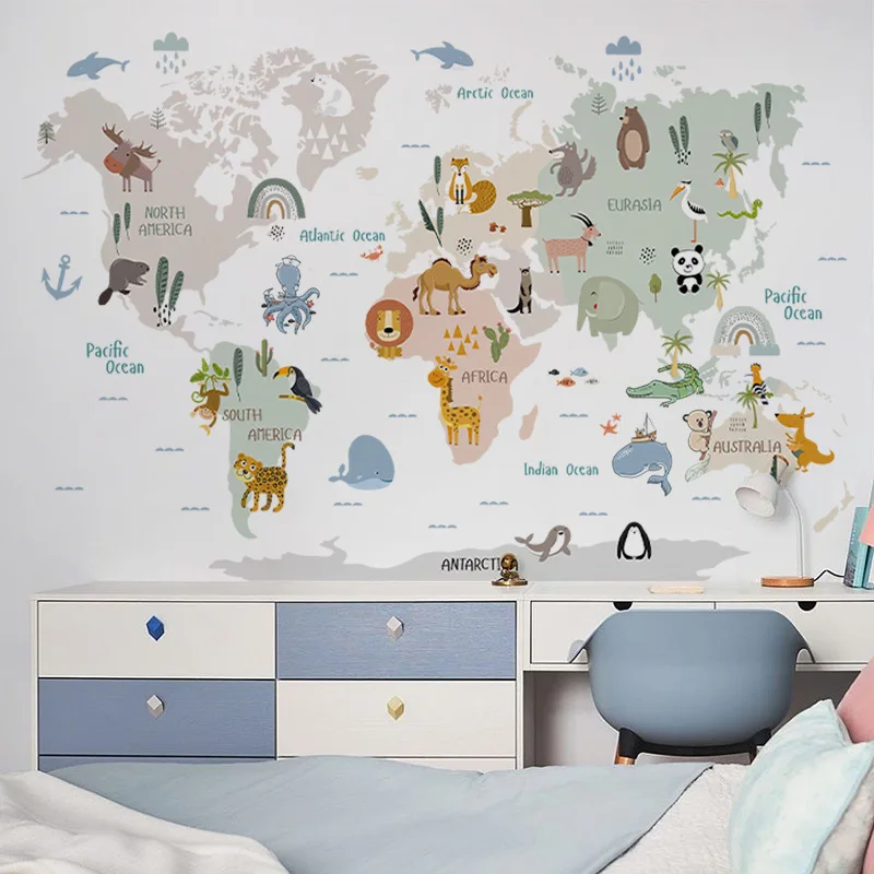 Purilite Select Kids Room Cartoon Animal World Map Wall Sticker