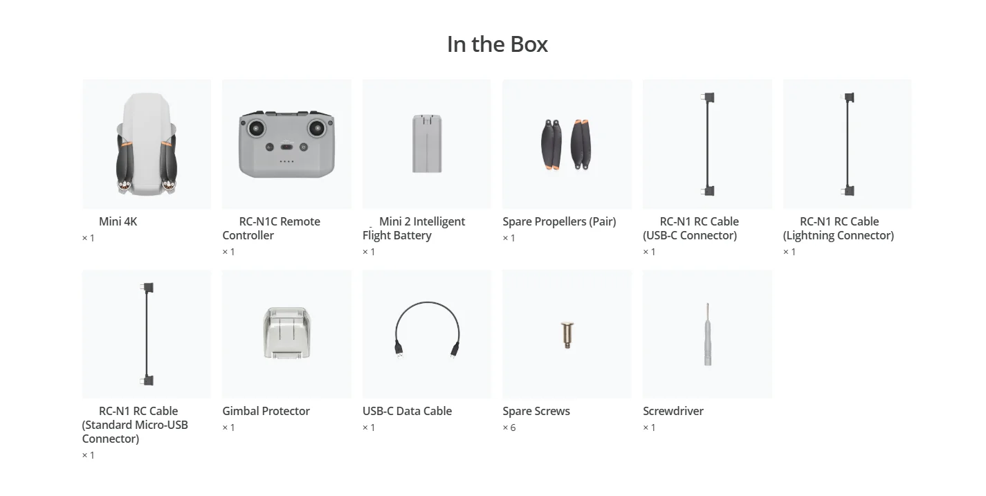 - Includes: drone, remote controller, battery, charger, spare propellers, manual