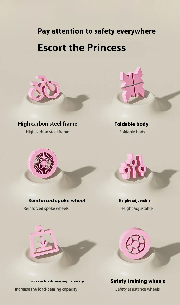Is mein training wheels hain taake chhote bachay asaani se balance seekh saken. Double V-brake system strong braking control deta hai aur foldable design isay asaani se store aur carry karne laayak banata hai.