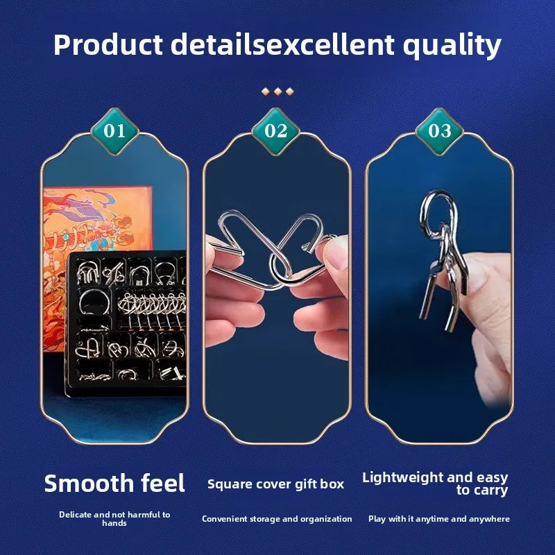Enhance problem-solving, logical thinking, and fine motor skills with the Purilite Select Nine-Link Intelligent Buckle Luban Lock Set. This educational puzzle toy set includes 24 intricately designed Luban locks, offering hours of brain training and hands-on learning for children.