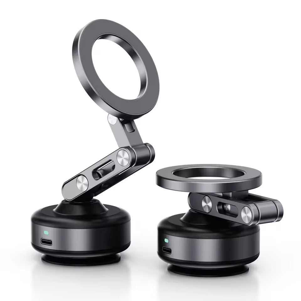 Its foldable design saves space when not in use. With advanced magnetic vacuum adsorption technology, this mount firmly holds your phone—even on uneven roads—without the need for clips or clamps.