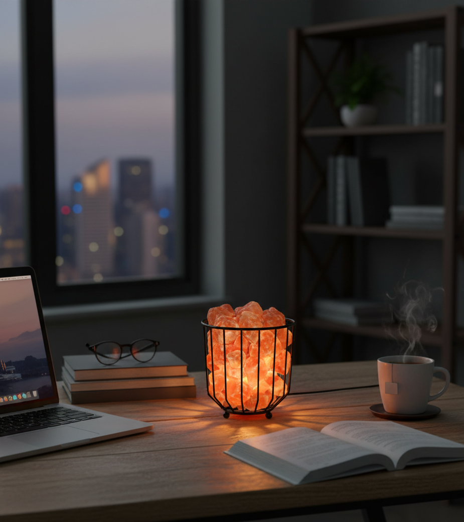 A sleek and stylish black metallic basket, designed using imported rods, spot welded, and powder coated for a durable and modern finish. Filled with natural Himalayan salt chunks, this lamp emits a gentle amber glow, ideal for creating a calm and cozy atmosphere. Offered in multiple regional plug and switch types.