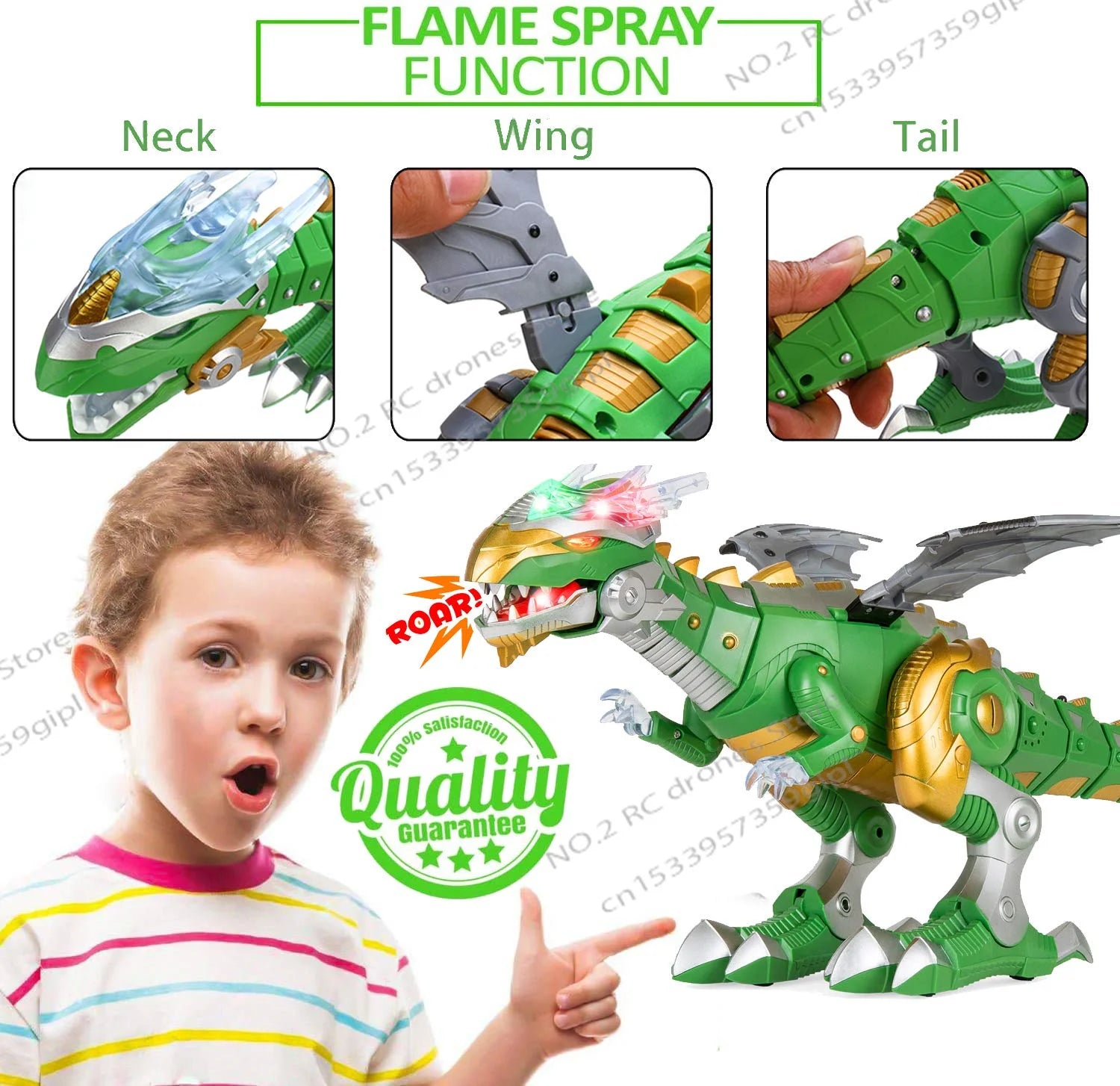 | ABS MATERIALUses premium ABS material that are nontoxic for your kid's safety | MIST SPRAY WITH LEDHas an LED light and sprays mist like smoke from its mouth, that imitates fire | REALISTIC ROARA Fun and Interactive Dinosaur toy with a realistic dinosaur roar sound | WALKING FEETComplete your kid's dinosaur experience as it walks back and forth as they play |