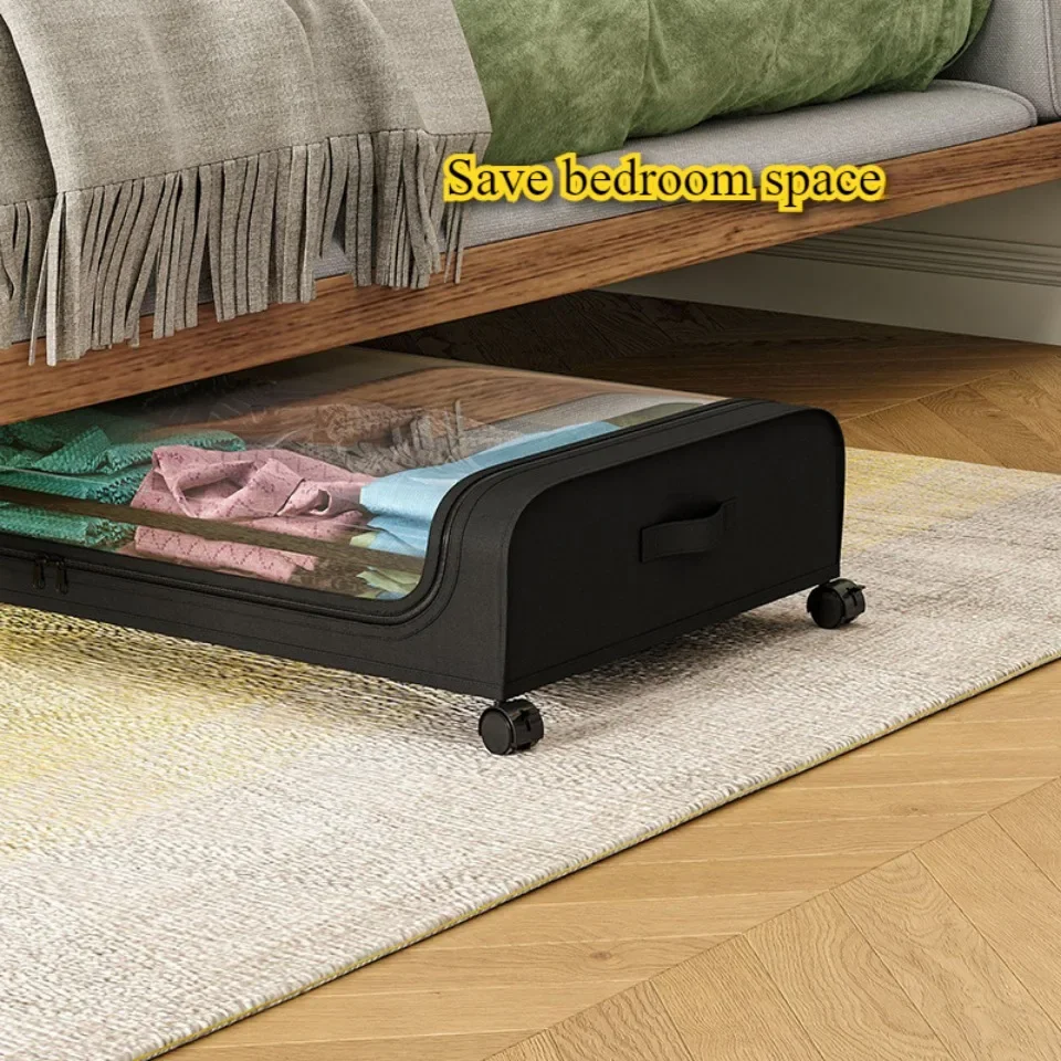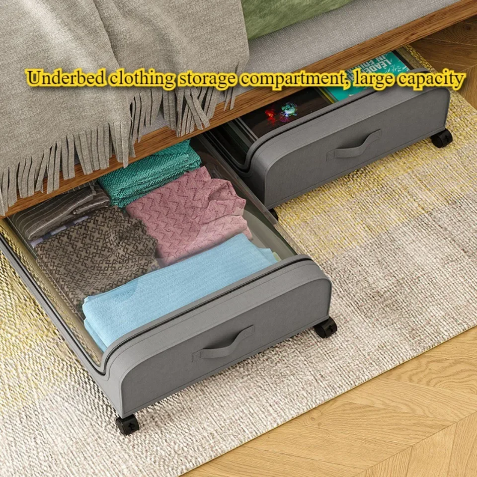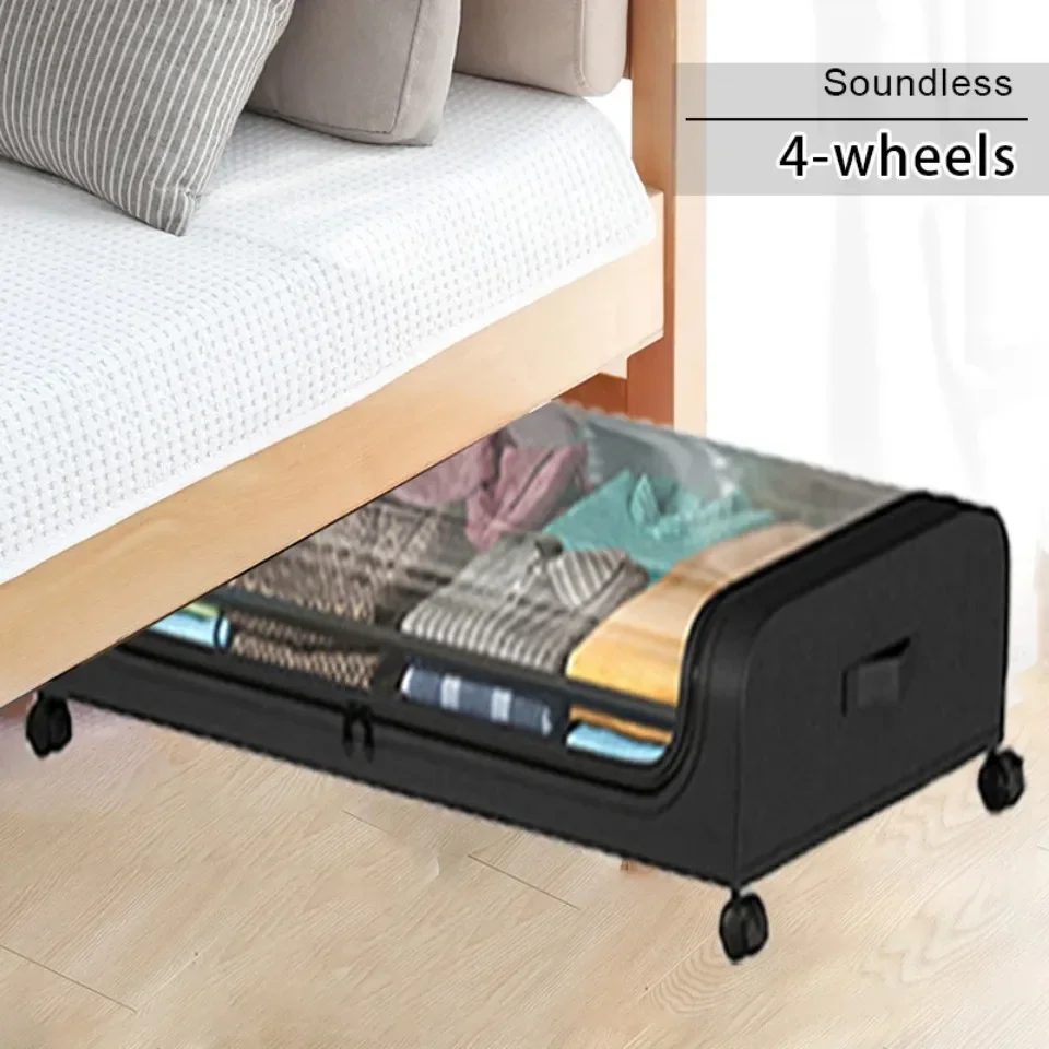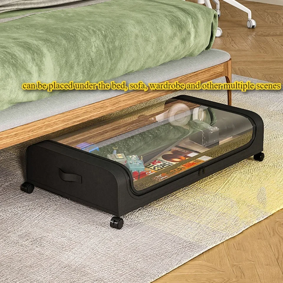 Built with a sturdy metal frame and durable fabric covering, this storage box offers strong load-bearing support along with dustproof and moistureproof protection. The transparent visible window allows quick identification of stored items without opening the box. Equipped with smooth wheels and a practical handle, it can be pulled out effortlessly, making daily access simple and convenient. Its foldable design ensures easy storage when not in use.